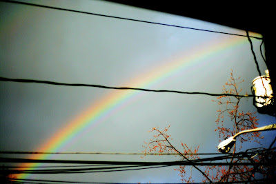 The Woman took this picture a few months back right on our front porch. All three of us were out there with her and were enjoying the early Spring air and shower. The fresh sniffs of the wet ground and the daffodils poking their heads out of the ground. All of a sudden this amazing rainbow showed up right outside our window. (Even more amazing the Woman was able to capture it).