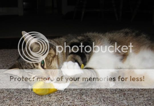 This is my favorite worldly possession. I love my banana and no other cat is allowed to touch it at all. Latte tries to eat it when he gets a chance so its all mine. I've actually had it for about a year now and everytime I see it it is all new again. I would have to rank the banana right under the Awesome Man in things I love in this world. OK, maybe Latte too.
